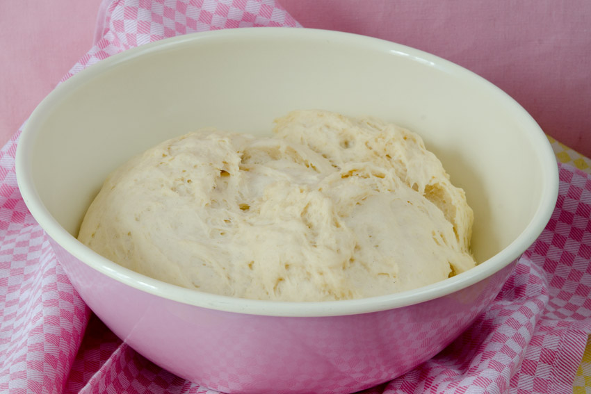 Das Mehl mit dem Kartoffelmehl und dem Zucker in einer Schüssel vermengen. Die Hefe mit etwas warmen Wasser verrühren. In das Mehl eine kleine Mulde drücken und die Hefe hineingießen. Den Topf abdecken und an einem warmen Ort 15 Minuten gehen lassen. Die restlichen Zutaten hinzugeben und mit dem Knethaken zu einem Teig verkneten. Den Teig wieder abdecken und 1 Stunde gehen lassen.